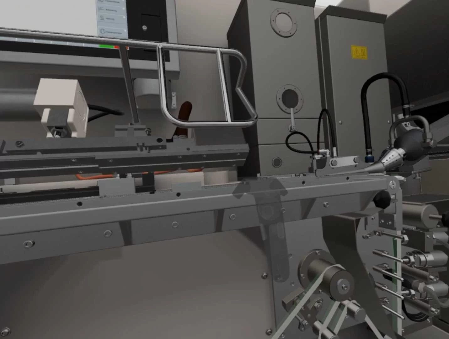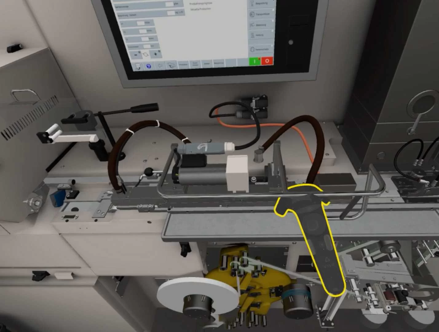 In diesem Fall handelt es sich um das Start- und Produktionskalibrierungsverfahren der KDF2-Maschine. Der Lernende wird dabei sowohl durch Texteinblendungen als auch durch die Sprachanweisungen des Trainers geführt.