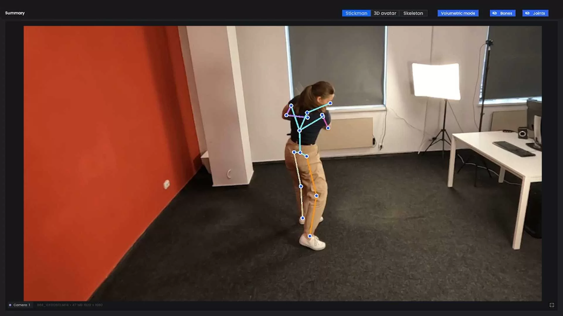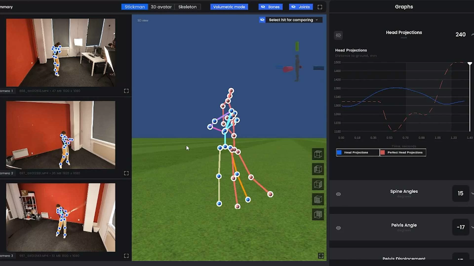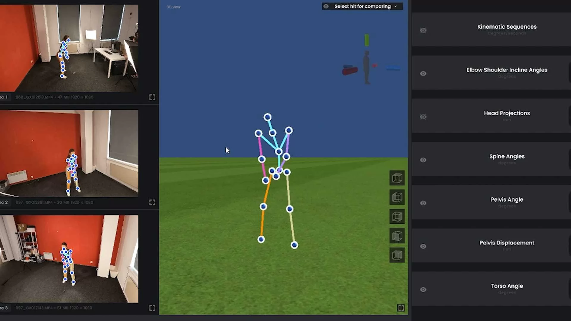 Die App analysiert aufgezeichnete Bewegungen und gibt Einblicke in Knie-, Schulter-, Hüft- und Armwinkel, in allgemeine Bewegungsmuster sowie in die Krafteinwirkung. Bemerkenswert ist, dass dies ohne physische Marker geschieht – es genügen Kameras, die aus drei verschiedenen Blickwinkeln aufgestellt werden (z. B. GoPro oder Basler).