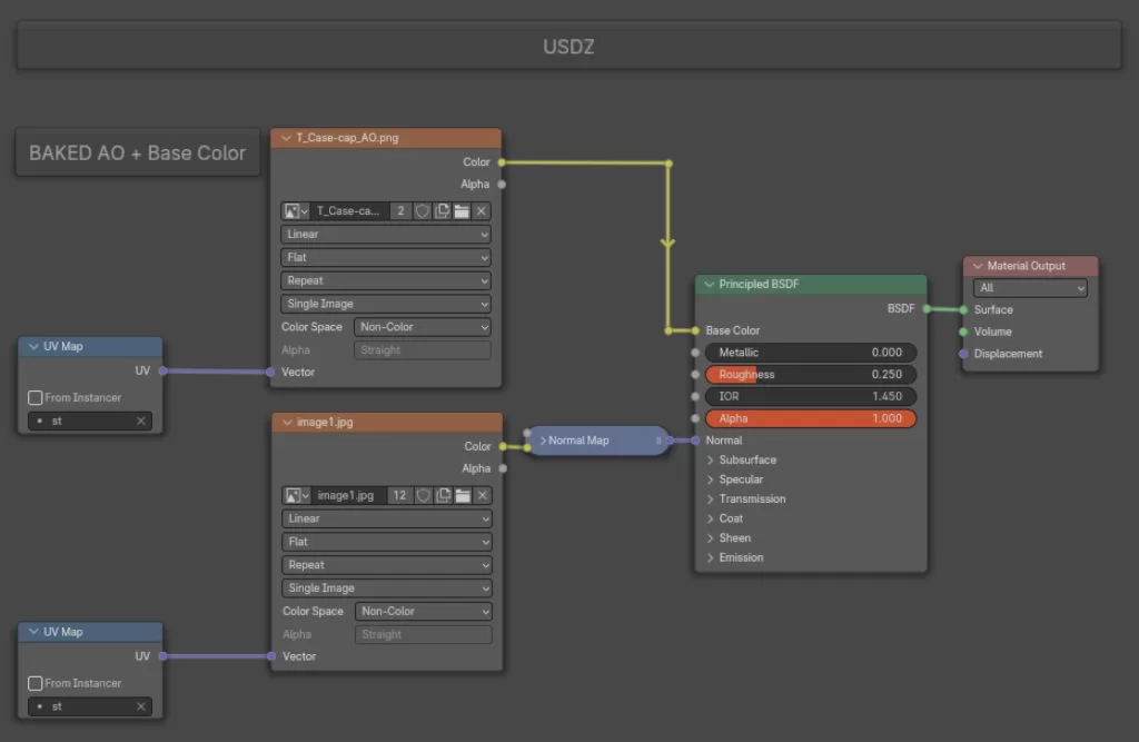 Bei der Entwicklung von Augmented-Reality-(AR)-Anwendungen ist es entscheidend, sich auf die Texturen zu konzentrieren, die in glTF – für Android-AR – und USDZ – für iOS-AR – Formate eingebunden werden können. Das USDZ-Format erfordert zusätzlichen Aufwand, um Outputs zu „baken“ und die Anzahl der Texturen zu minimieren. Das glTF-Format hingegen liefert beeindruckende Ergebnisse bei der Verwendung von Material Nodes, wie in den untenstehenden Abbildungen gezeigt. Es ist wichtig zu beachten, dass glTF-Dateien im Allgemeinen eine kleinere Dateigröße haben als USDZ-Dateien.